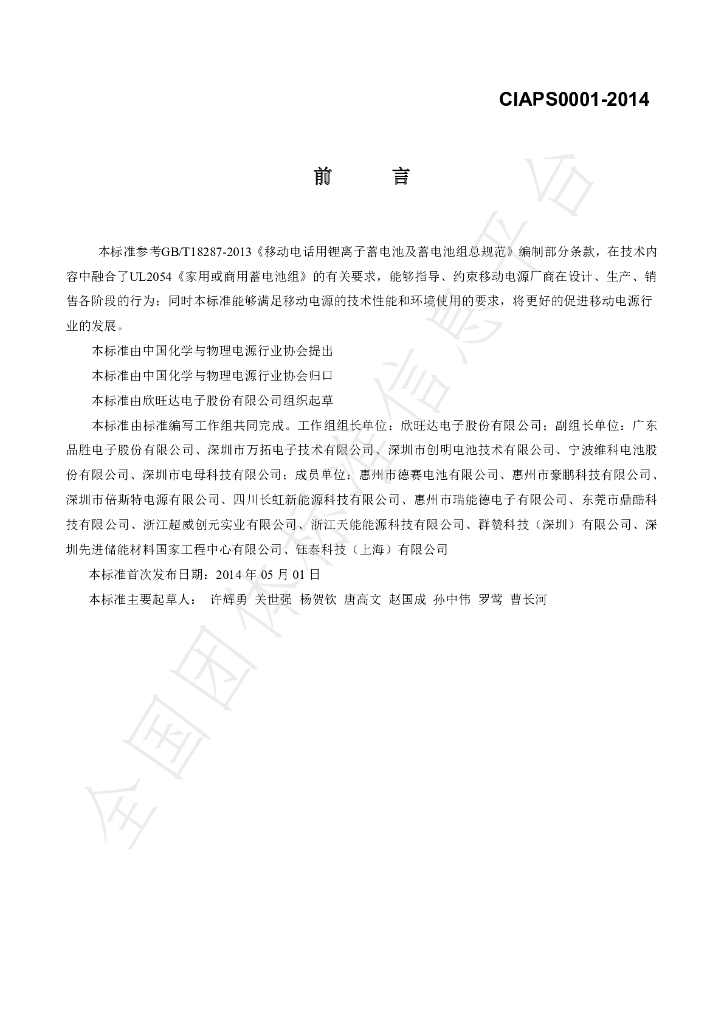 欣旺达电子股份有限公司、广东品胜电子股份有限公司、深圳市万拓电子技术有限公司、深圳市创明电池技术有限公司、宁波维科电池股份有限公司、深圳市电母科技有限公司、惠州市德赛电池有限公司、惠州市豪鹏科技有限公司、深圳市倍斯特电源有限公司、四川长虹新能源科技有限公司、惠州市瑞能德电子有限公司、东莞市鼎酷科技有限公司、浙江超威创元实业有限公司、浙江天能能源科技有限公司、群赞科技(深圳)有限公司、深圳先进储能材料国家工程中心有限公司、钰泰科技(上海)有限公司