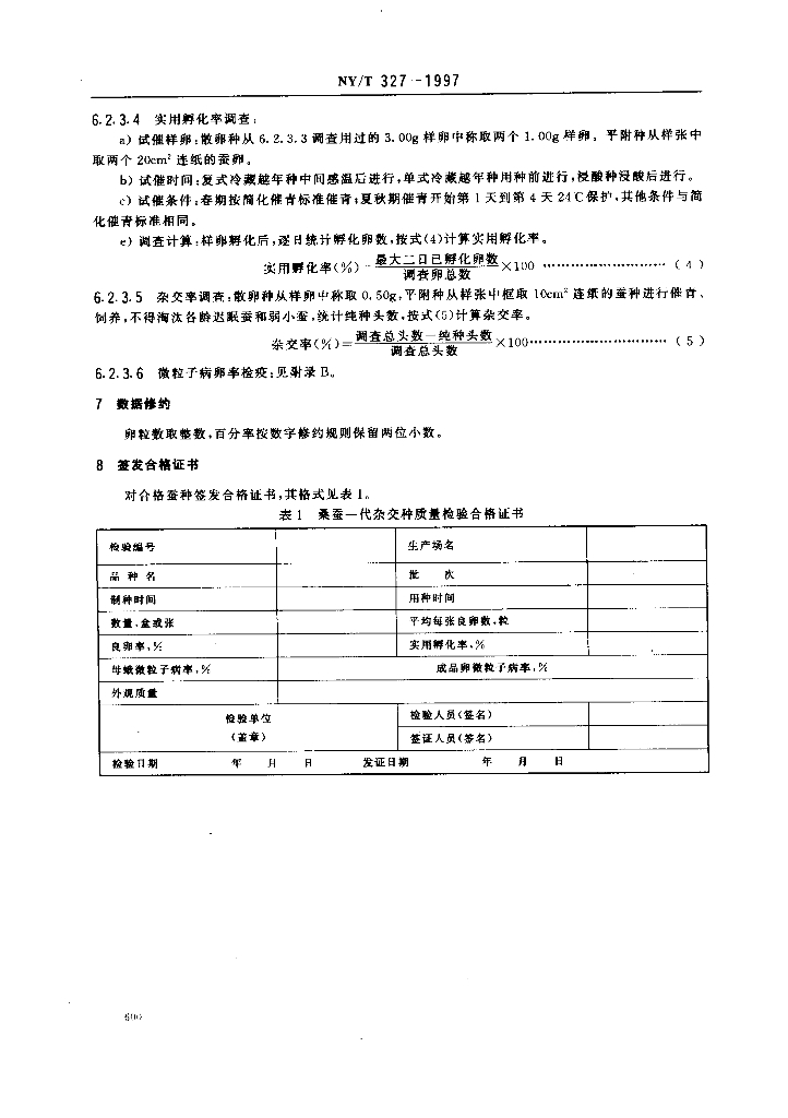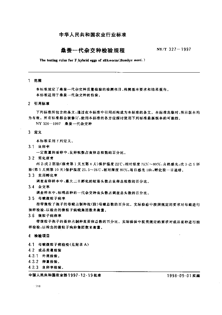 NY/T 327-1997 桑蚕一代杂交种检验规程