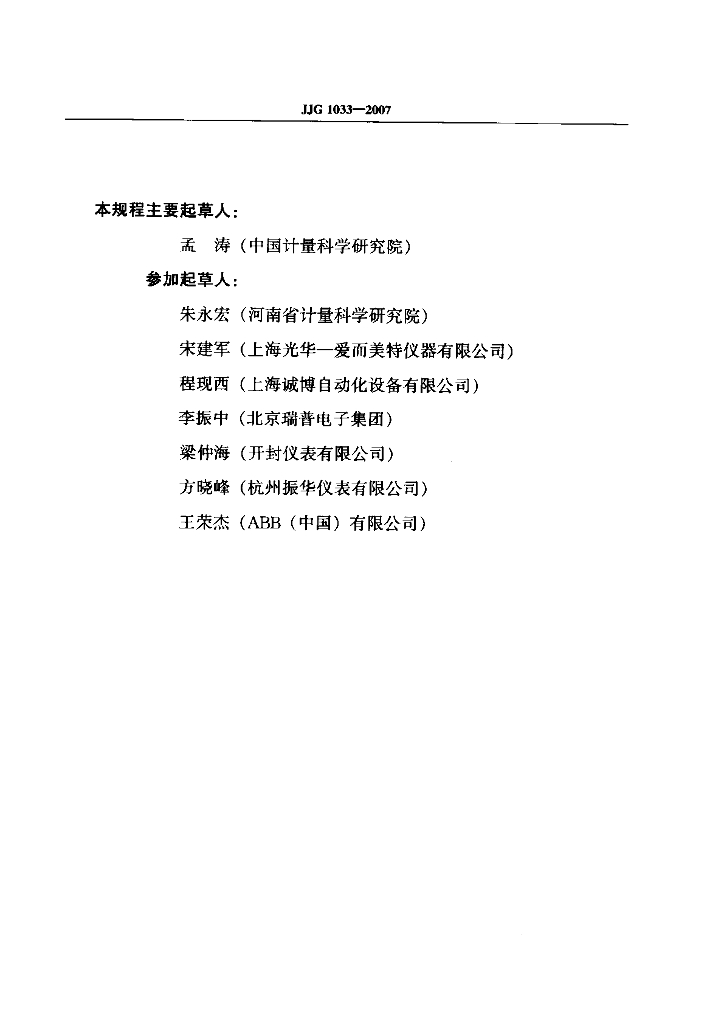 孟涛(中国计量科学研究院)、朱永宏(河南省计量科学研究院)、宋建军(上海光华一爱而美特仪器有限公司)、程现西(上海诚博自动化设备有限公司)、李振中(北京瑞普电子集团)、梁仲海(开封仪表有限公司)、方晓峰(杭州振华仪表有限公司)、王荣杰(ABB(中国)有限公司)