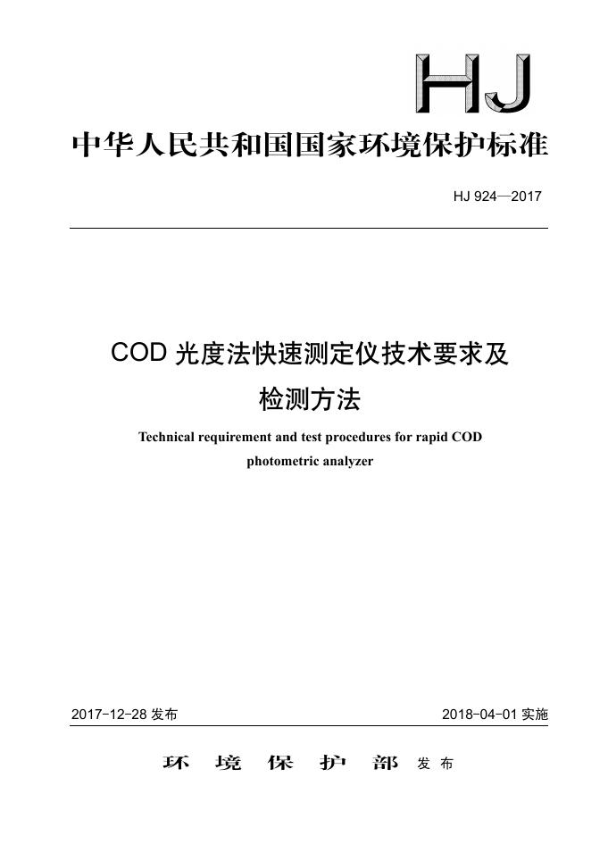HJ 924-2017 COD光度法快速测定仪技术要求及检测方法