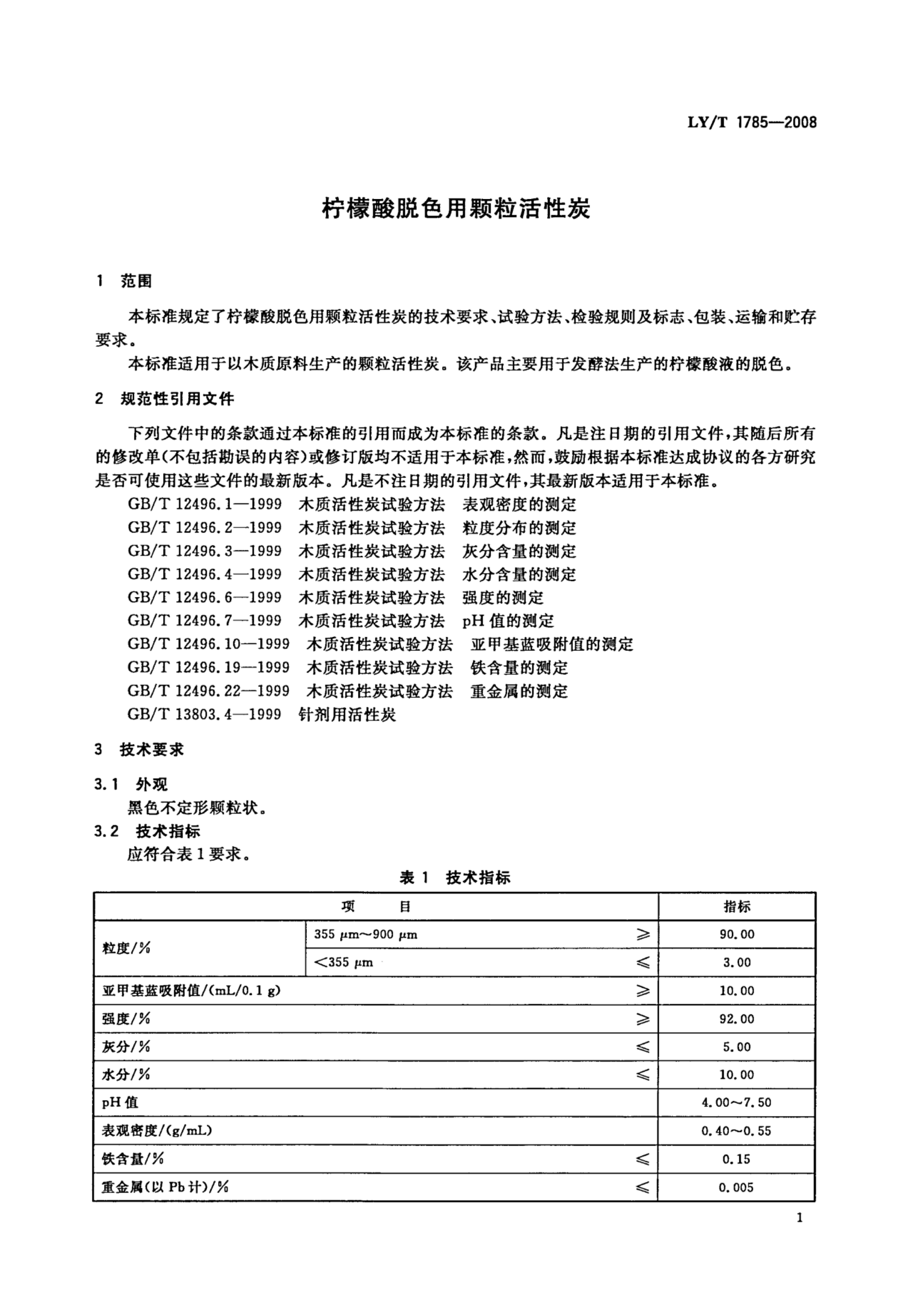 LY/T 1785-2008 柠檬酸脱色用颗粒活性炭