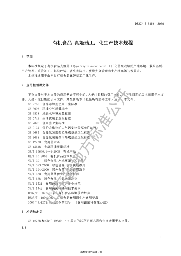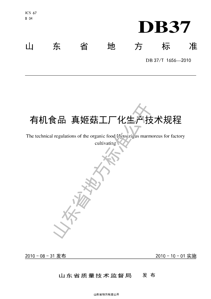 DB37/T 1656-2010 有机食品 真姬菇工厂化生产技术规程
