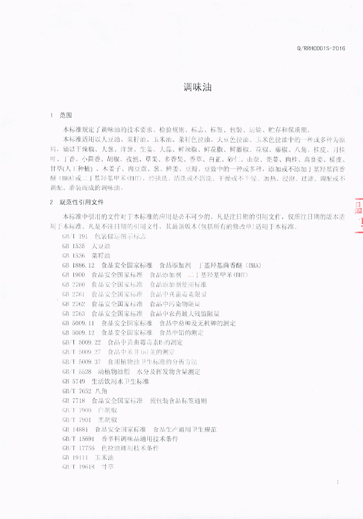 Q/RRH 0001S-2016 四川人人会食品有限公司 调味油