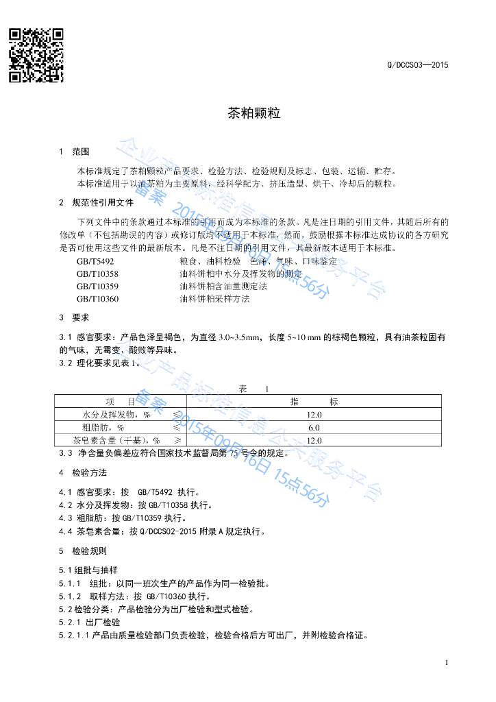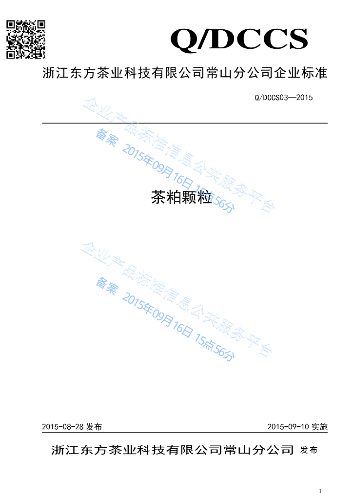 Q/DCCS 03-2015 浙江东方茶业科技有限公司常山分公司 茶粕颗粒