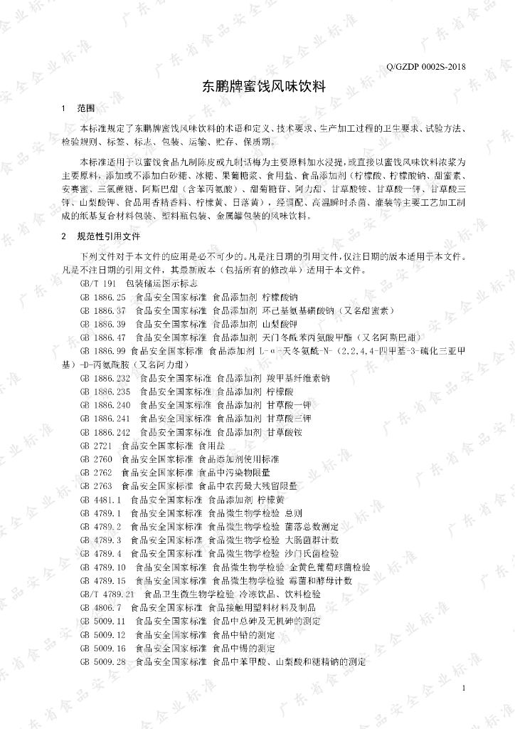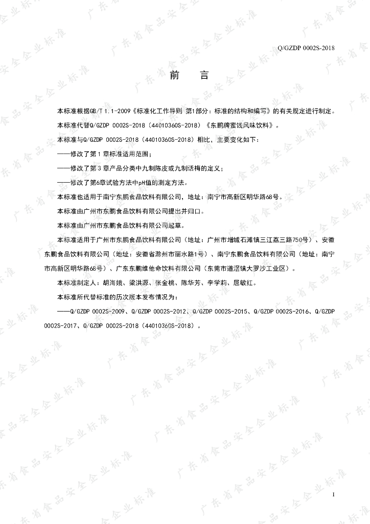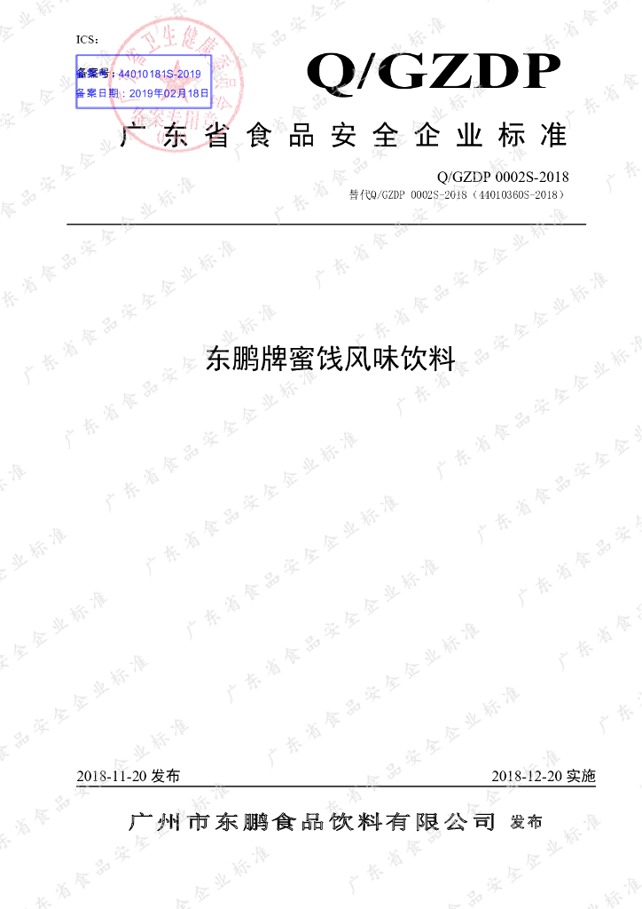 Q/GZDP 0002S-2018 东鹏牌蜜饯风味饮料