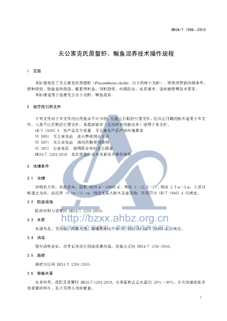 DB34/T 1206-2010 无公害克氏原螯虾、鳜鱼综合高效养殖技术操作规程
