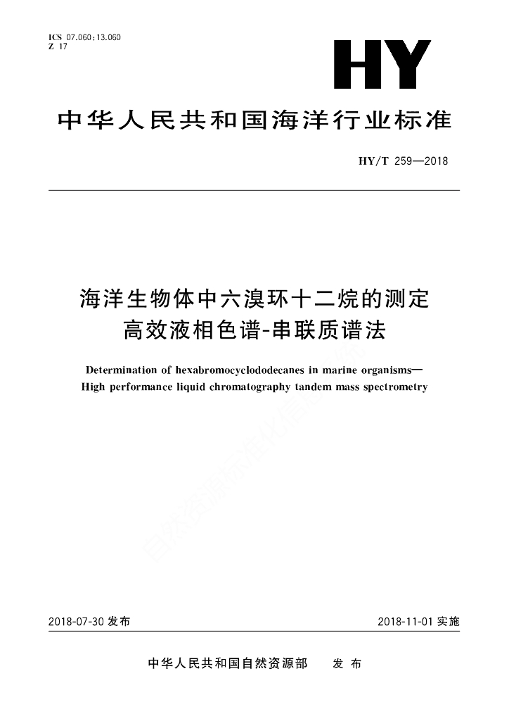 HY/T 259-2018 海洋生物体中六溴环十二烷的测定 高效液相色谱-串联质谱法