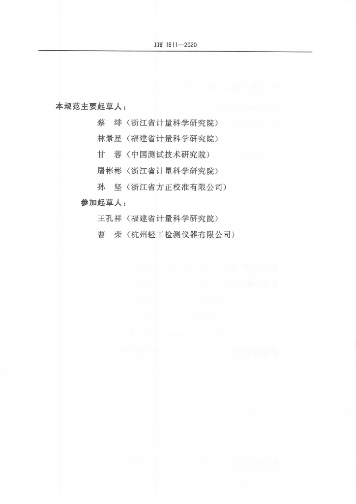 蔡绯(浙江省计量科学研究院)、林景星(福建省计量科学研究院)、甘蓉(中国测试技术研究院)、屠彬彬(浙江省计量科学研究院)、孙坚(浙江省方正校准有限公司)、王孔祥(福建省计量科学研究院)、曹荣(杭州轻工检测仪器有限公司)