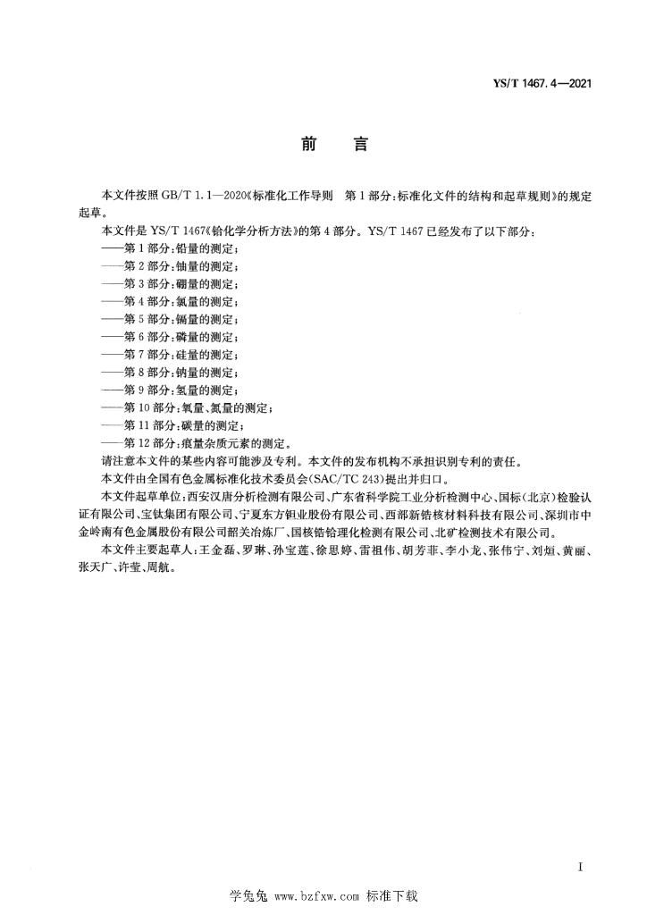 西安汉唐分析检测有限公司、广东省科学院工业分析检测中心、国标(北京)检验认证有限公司、宝钛集团有限公司、宁夏东方钽业股份有限公司、西部新核材料科技有限公司、深圳市中金岭南有色金属股份有限公司韶关冶炼厂、国核锆铪理化检测有限公司、北矿检测技术有限公司