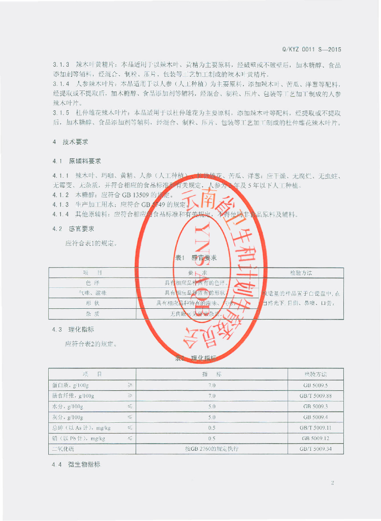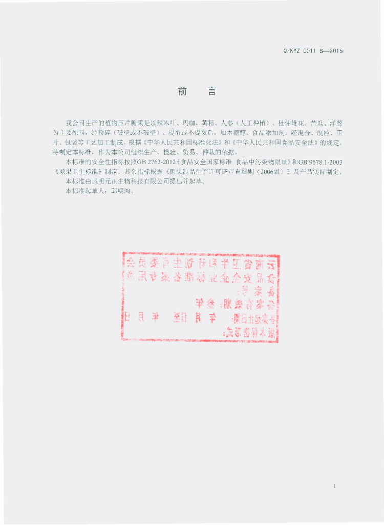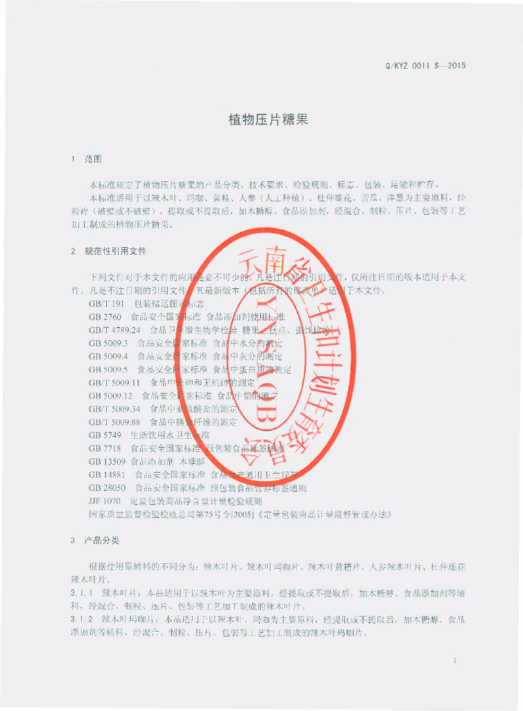 Q/KYZ 0011S-2015 昆明元正生物科技有限公司 植物压片糖果
