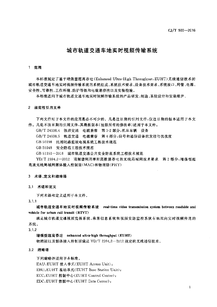 CJ/T 500-2016 城市轨道交通车地实时视频传输系统