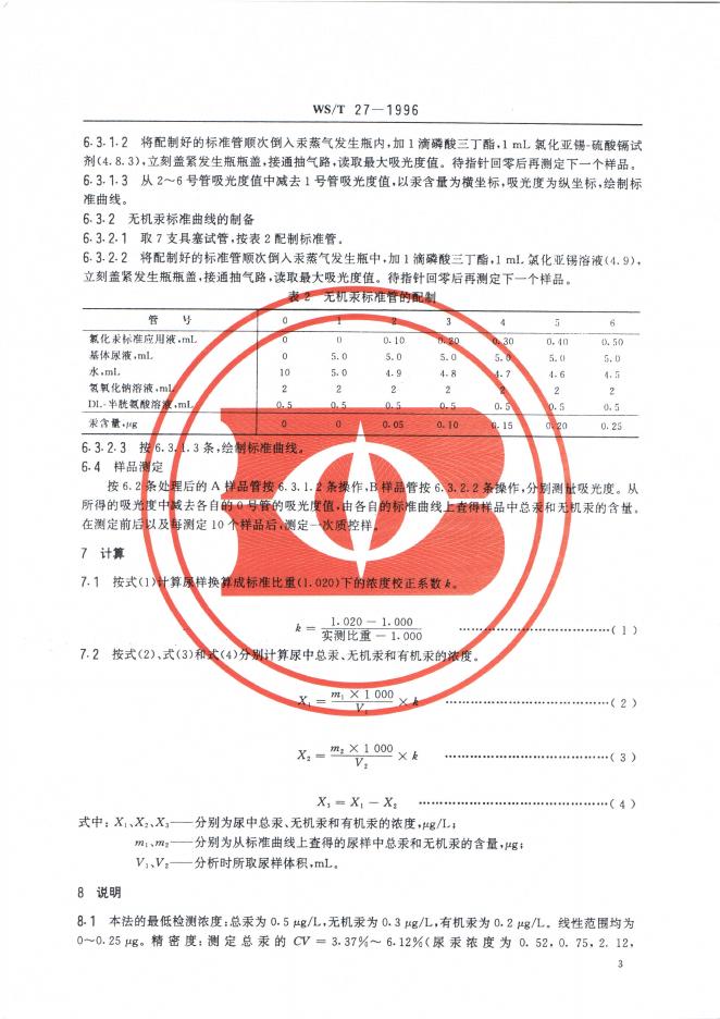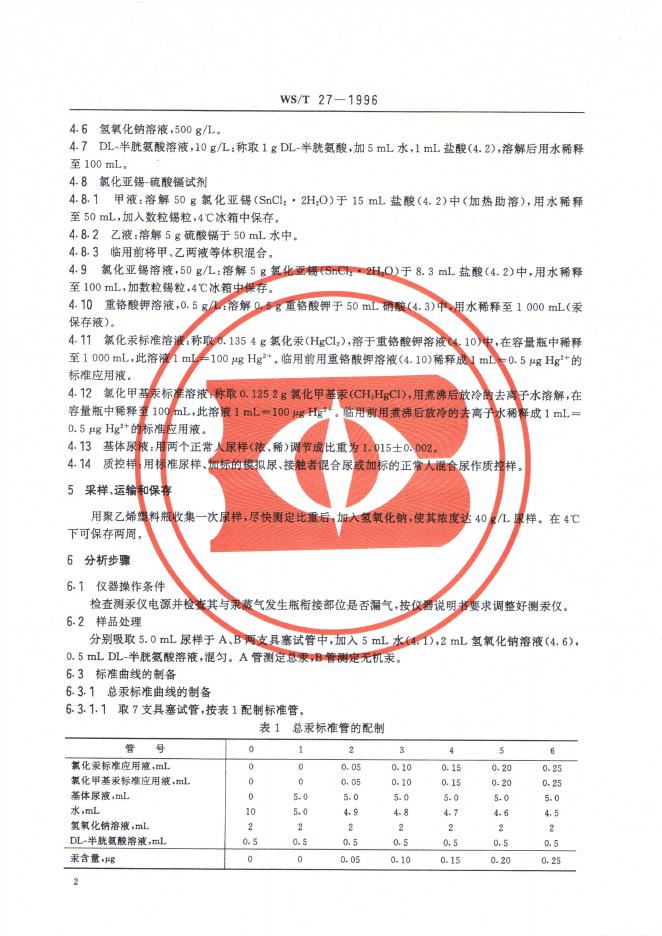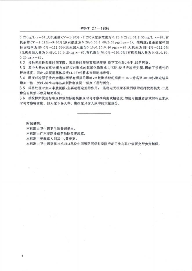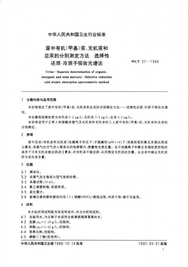 WS/T 27-1996 尿中有机(甲基)汞、无机汞和总汞的分别测定方法——选择性还原——冷原子吸收光谱法
