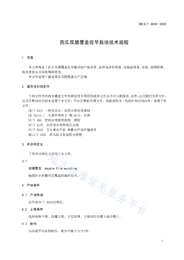 DB15/T 3830-2025 西瓜双膜覆盖促早栽培技术规程
